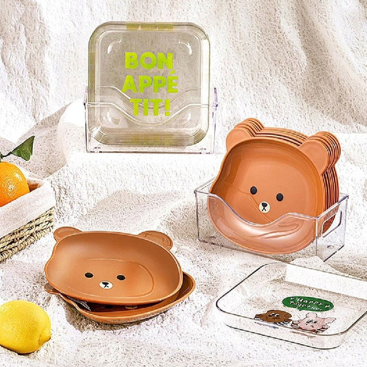 •The dinner plates feature a charming cartoon bear shape and come with a convenient stand for storage.